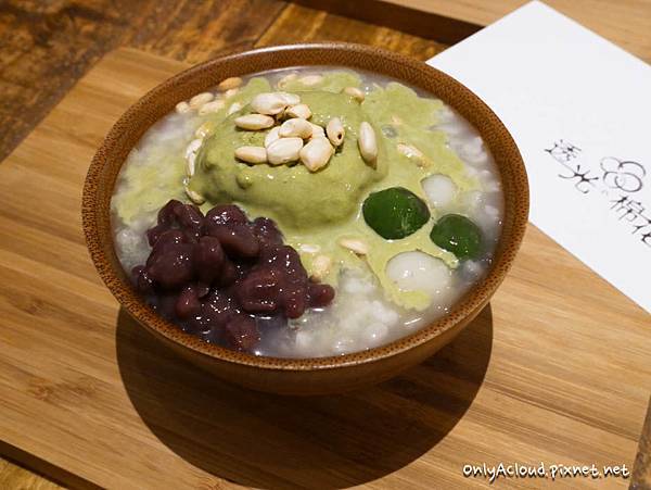 而白玉(湯圓)不管是倒入薏仁或是抹茶汁中都很適合,