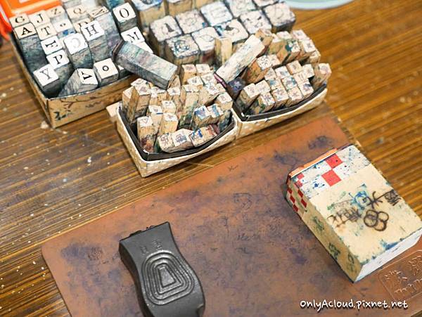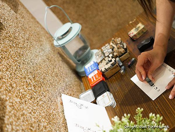 上面放著透光棉花的空白名信片和各種英文字母的印章。