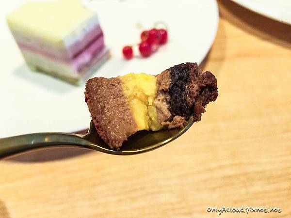 黃色那層百香果的酸和巧克力的微甜滋味比較分明,
