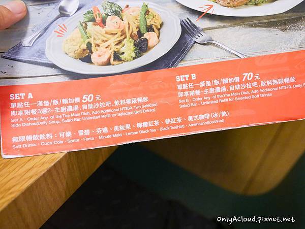 套餐B 加70元是三種主廚濃湯、自助沙拉吧、飲料無限暢飲都有。